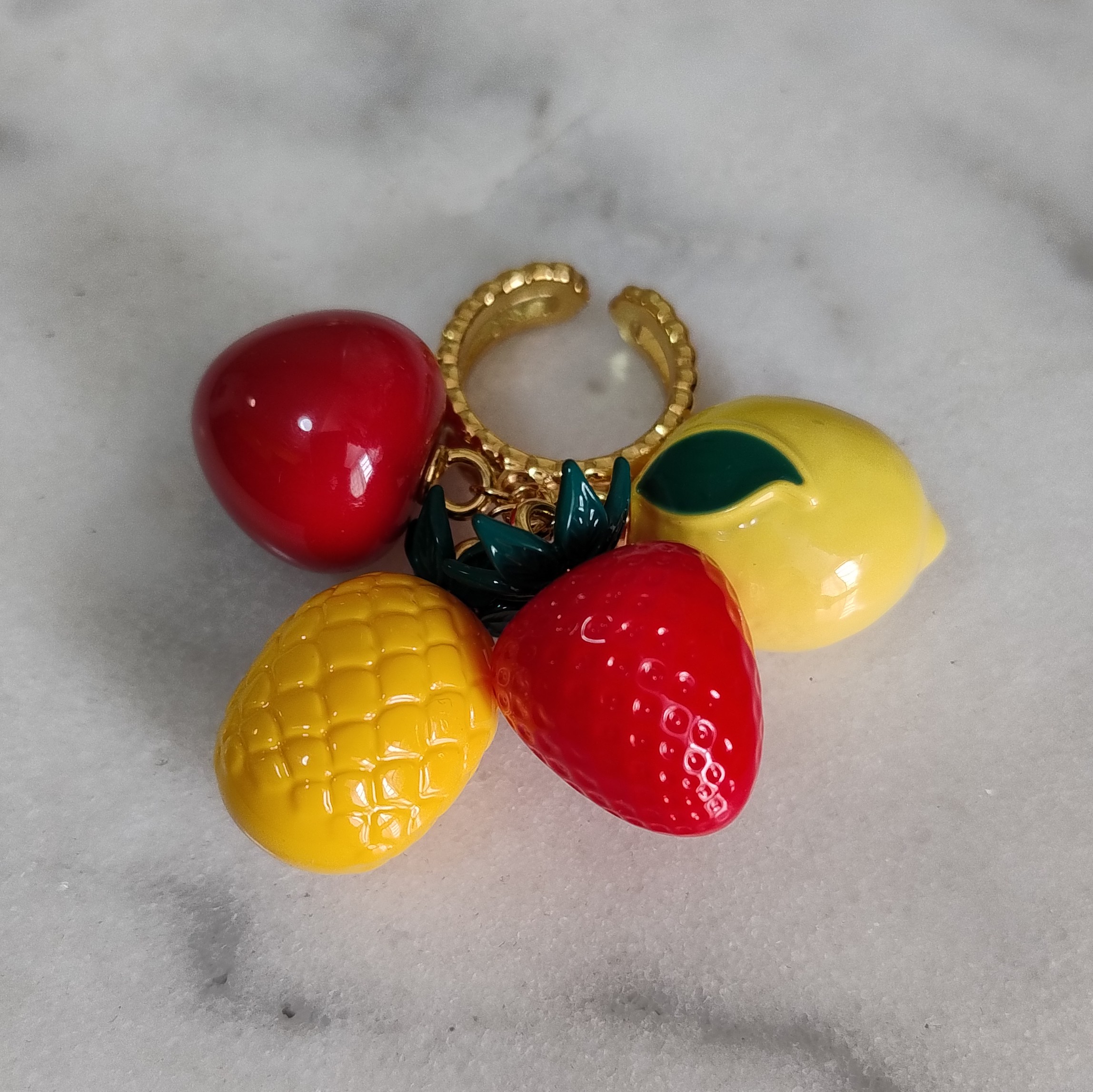 Anel duplo dourado com frutas foi criado para mulheres que expressam estilo sem precisar de muitas palavras.