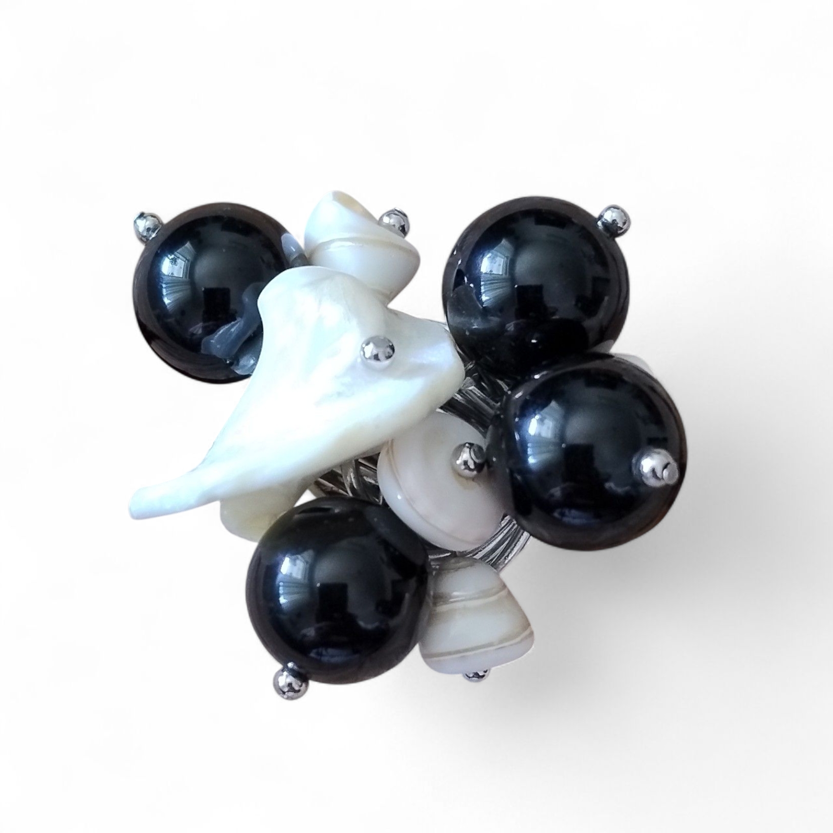 Este anel é confeccionado em 6 voltas de fio de alumínio e um mix de pedras naturais, conchas e madrepérolas. Aro 19