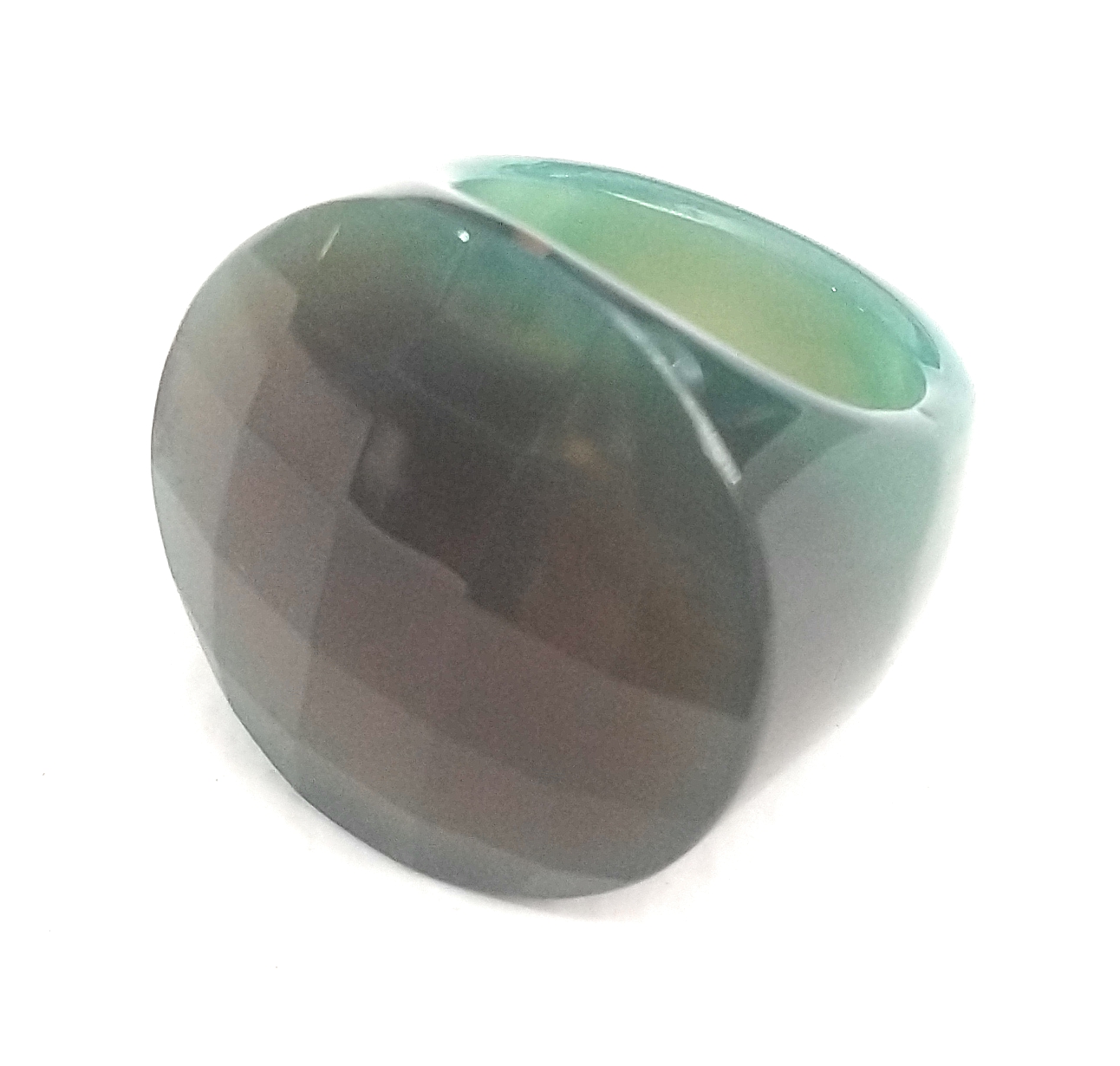 Um anel expressivo todo em ágata verde é uma escolha elegante e sofisticada. Pode ser uma peça cativante para quem aprecia a beleza natural das pedras. Este anel possui superfície redonda levemente ovalada e toda fecetada, diâmetro 2,6 cm, aro 20.