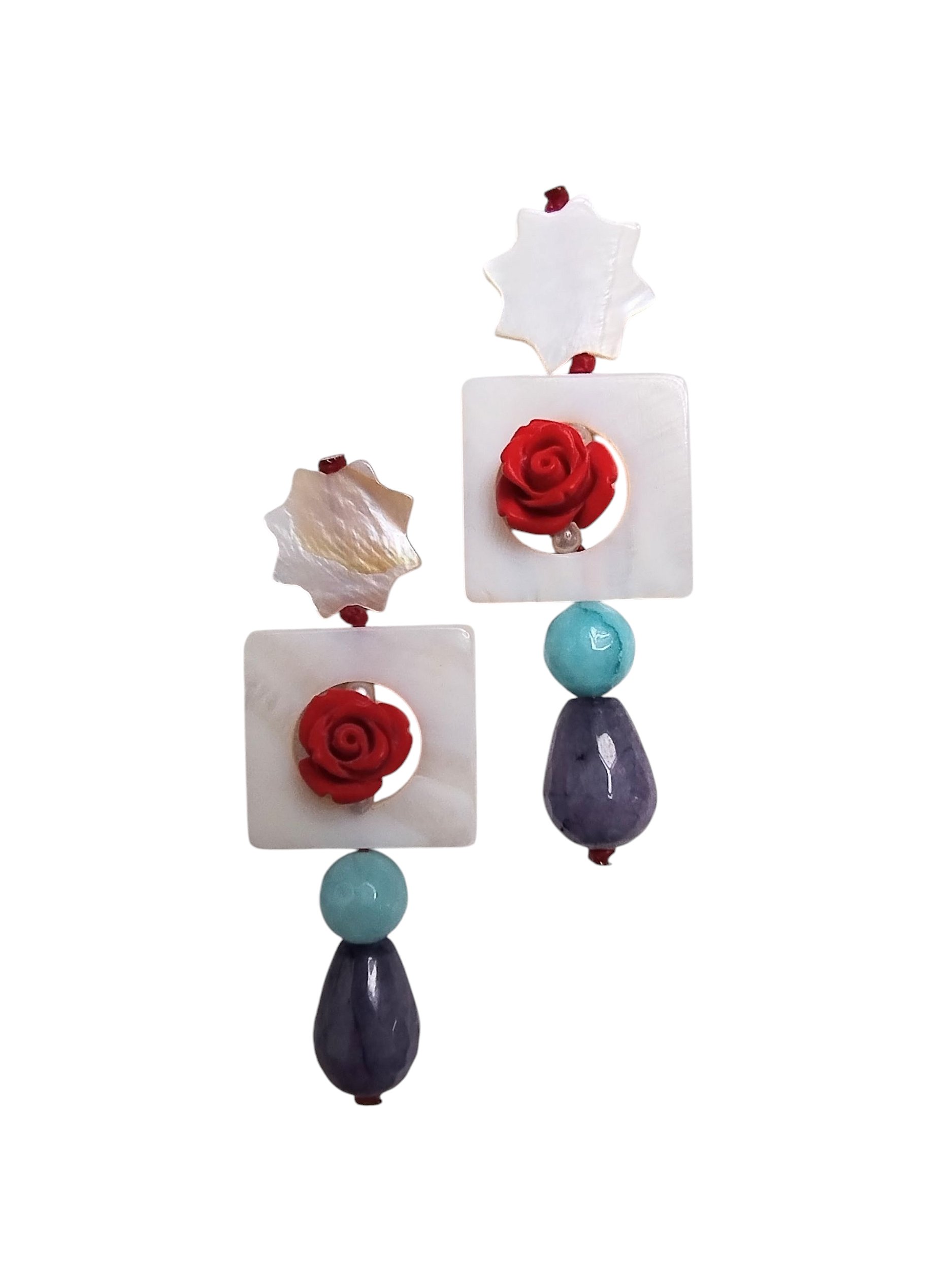Um brinco simplesmente encantador. Confeccionado com flor de cinábrio sobre madrepérola, ele ganha vida com o toque sereno da ágata azul-celeste e a elegância da gota de sodalita. O resultado é uma peça única, feminina e cheia de charme, que transmite leveza e delicadeza em cada detalhe. Perfeito para mulheres que amam expressar sua beleza com autenticidade.