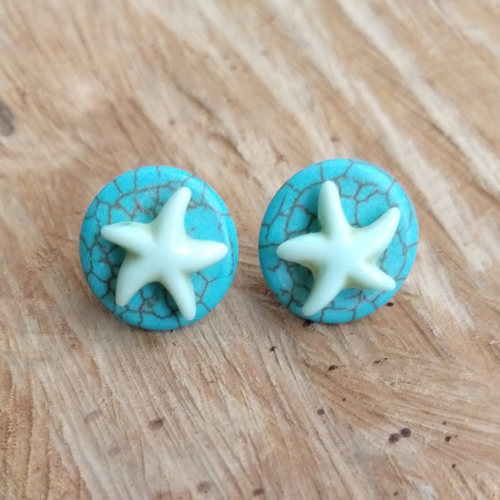 Brinco chapado em pedra howlita, com madrepérola, acabamento em aço. Diâmetro 2cm