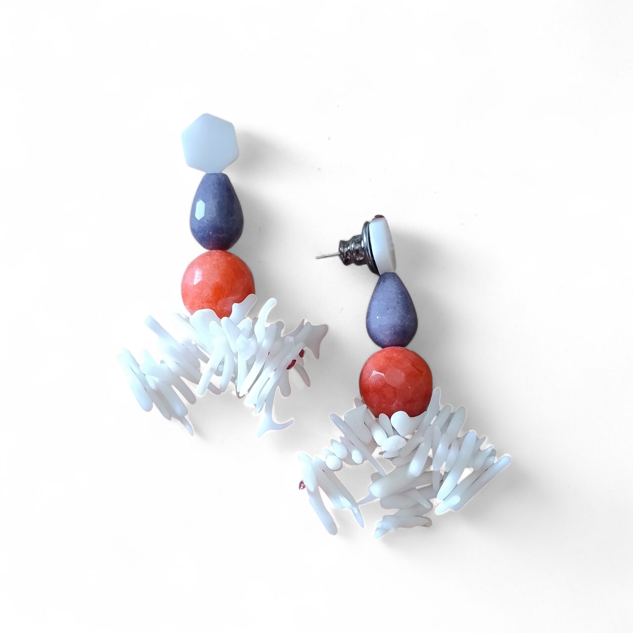Este brinco dispensa comentários. Inicia com uma bela madrepérola — marca registrada em grande parte dos nossos designs — seguida de ágata e jaspe facetada, finalizando com três chuvas de mini corais brancos. Um mix encantador de texturas e brilho natural.
