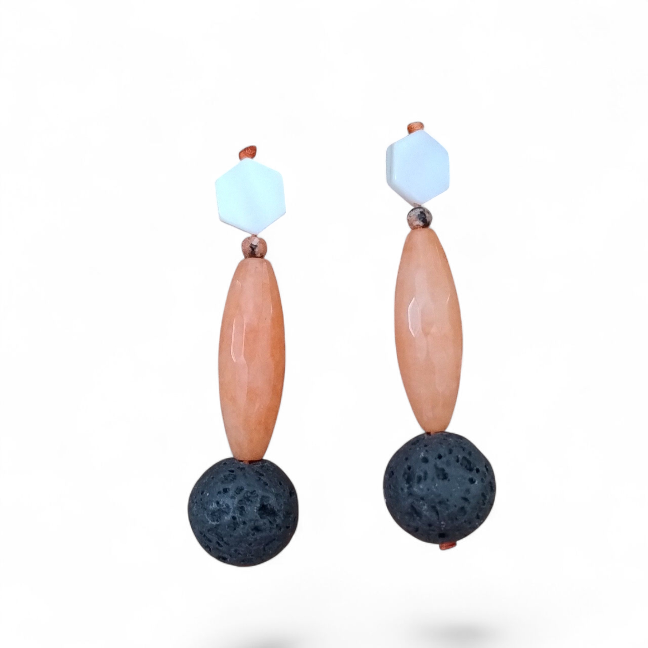 Brinco confeccionado com madrepérola, bujão de ágata salmão e esfera de pedra vulcânica. Uma composição elegante e autêntica, cheia de estilo e carisma, que valoriza o natural com um toque moderno e sofisticado.