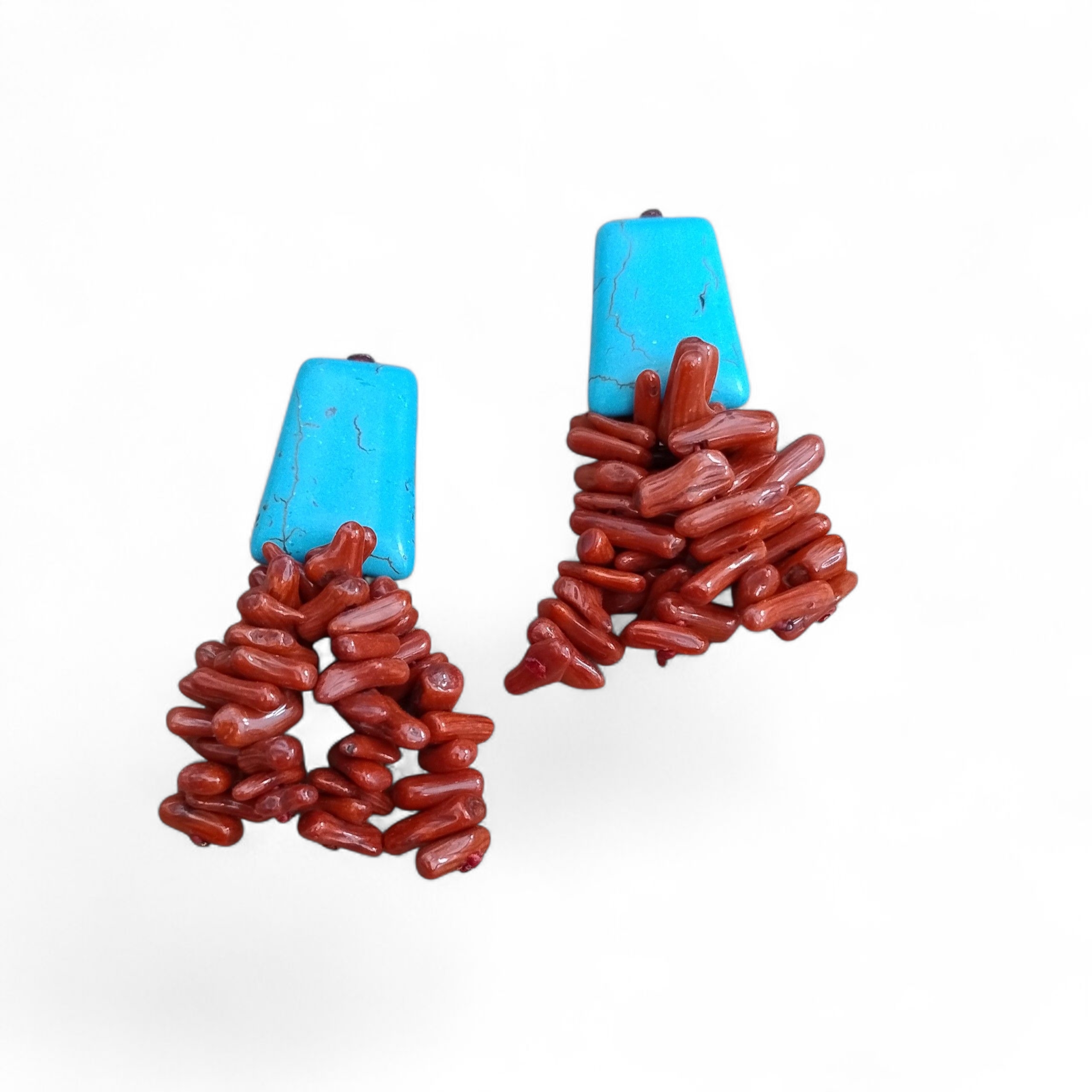Arrojado e vibrante, o Brinco Leandra une howlita turquesa e mini corais vermelhos em 50 mm de pura personalidade.