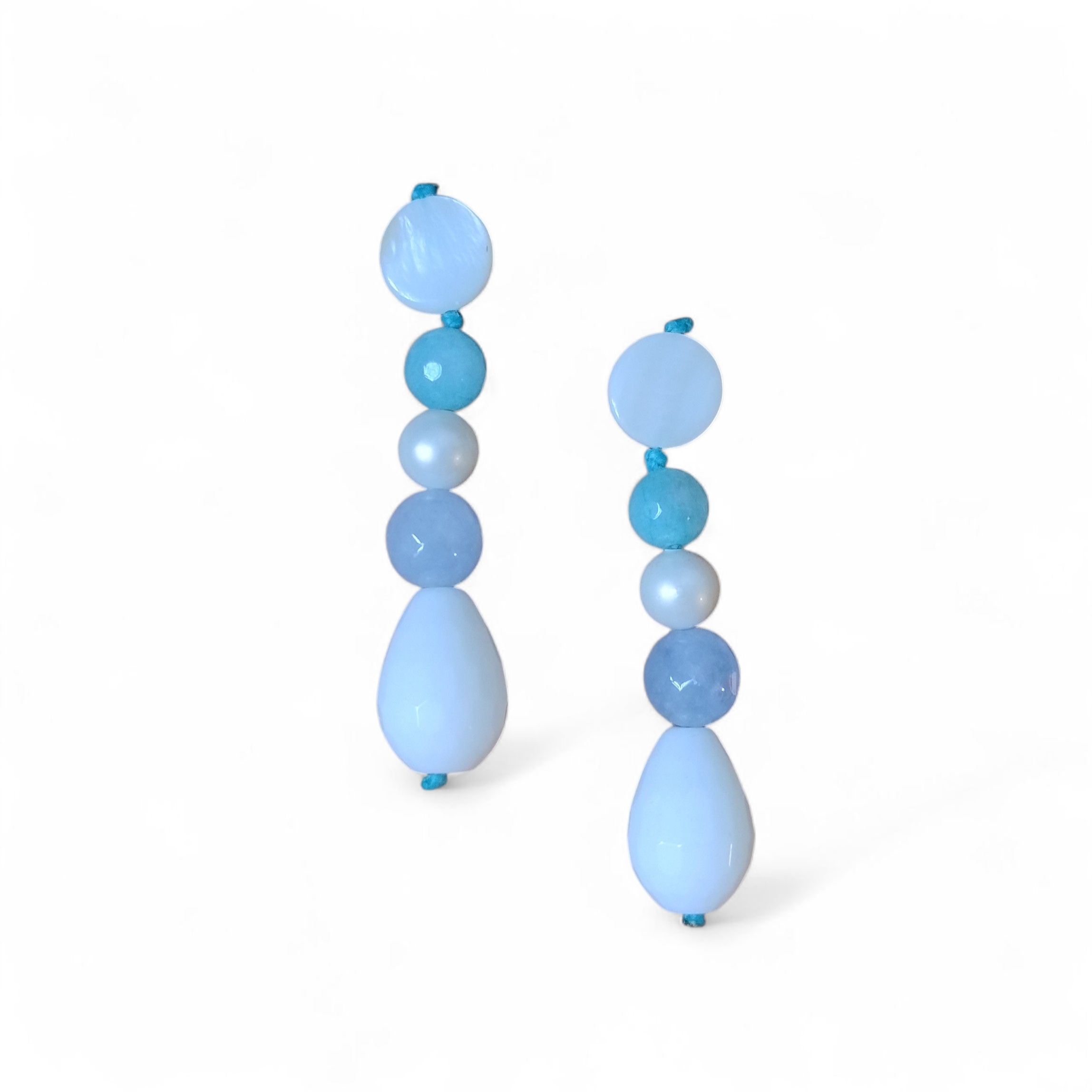 Brinco em delicados tons de azul, com pérola de água doce e gota de jaspe branca facetada. Uma combinação sofisticada e sutil, que reflete luz e elegância em cada movimento. Leve, harmonioso e cheio de encanto natural. Pino em aço e tarraxa confot 10 mm.