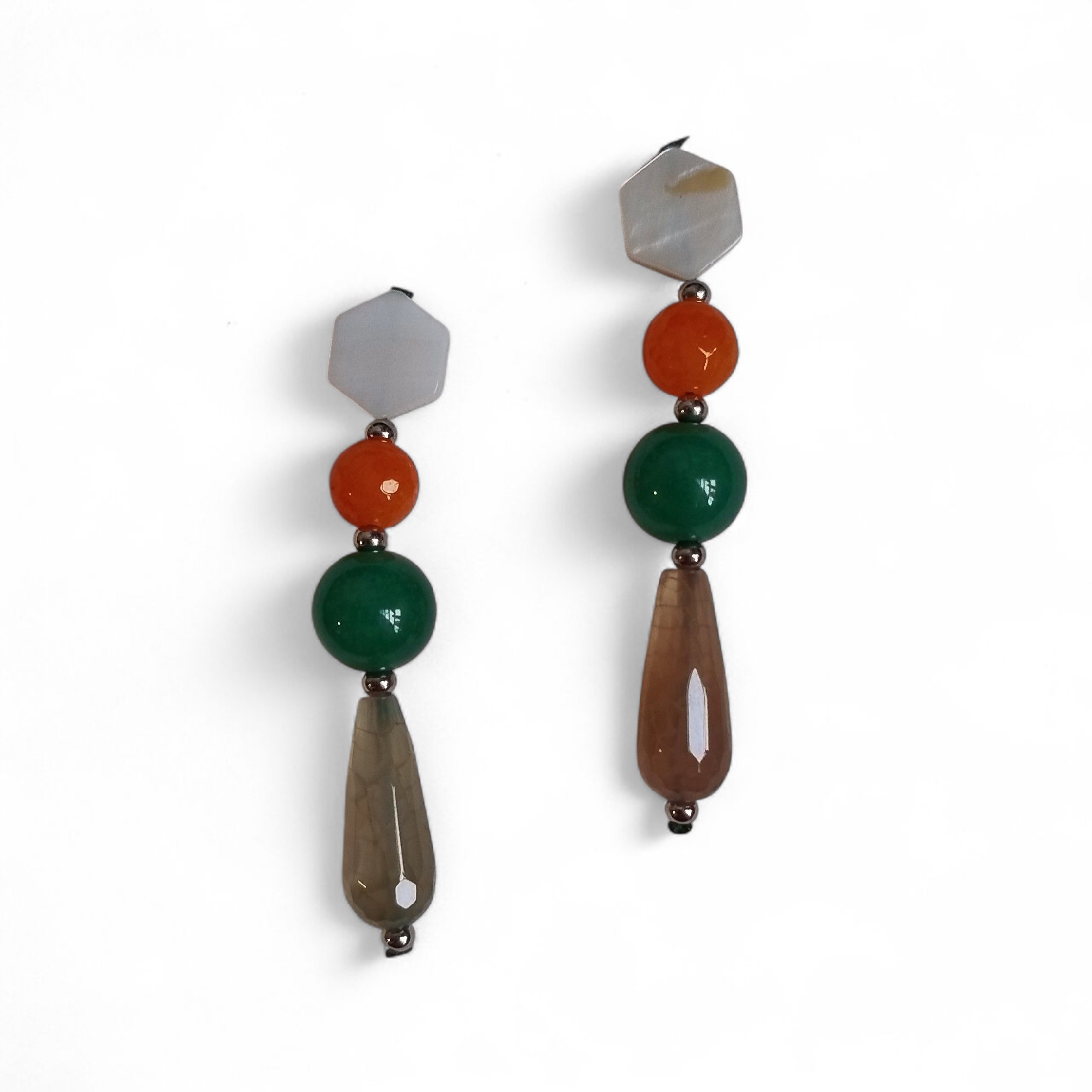 Brinco com ágata facetada coral, verde lisa e gota rutilada, realçado por delicados pontos de luz em aço. Uma peça que irradia luminosidade e altivez, perfeita para destacar qualquer look com sofisticação e personalidade.