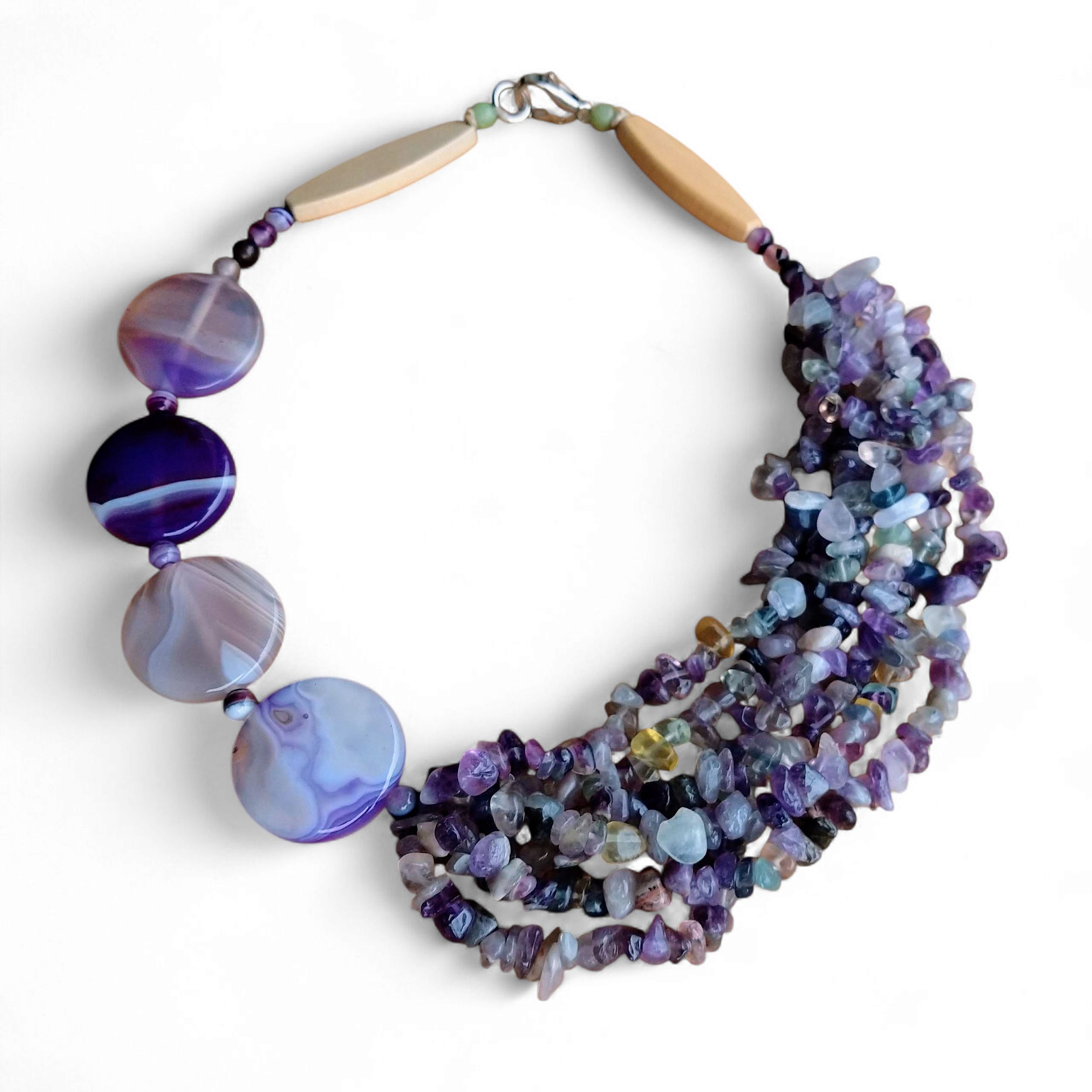 Maxi colar cheio de luz, confeccionado com ágata mesclada e um mix de cascalhos cuidadosamente selecionados. Com oito fio de pedras, a beleza está na harmonia das tonalidades que transitam entre o lilás, o roxo e o verde — uma combinação equilibrada e sofisticada, que transmite energia e elegância natural.