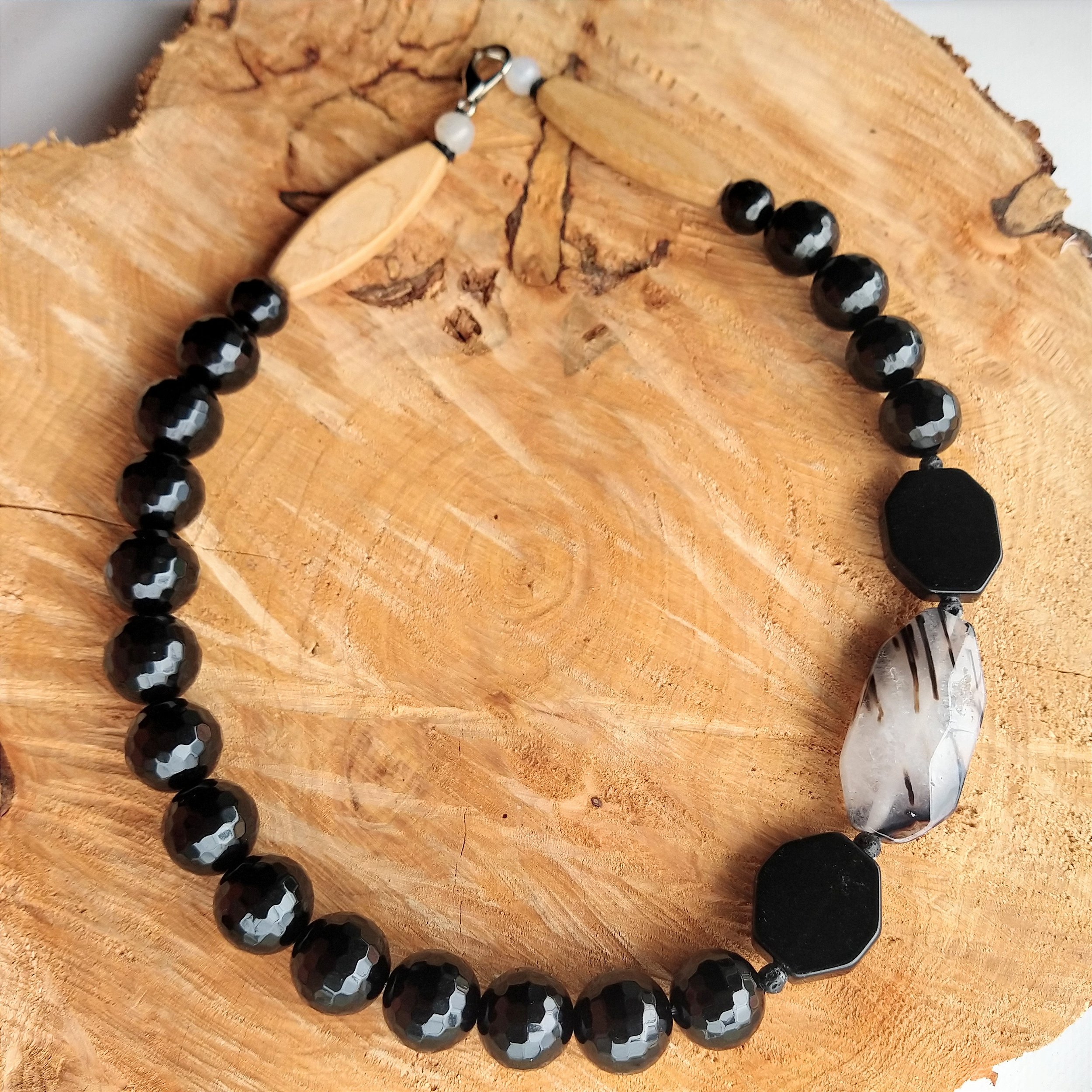 Colar Ágata facetada com detalhes e Ágata sextavada e grande Ágata mesclada, finalizado com bujão madeira e fecho lagosta prata. Comprimento 53 cm