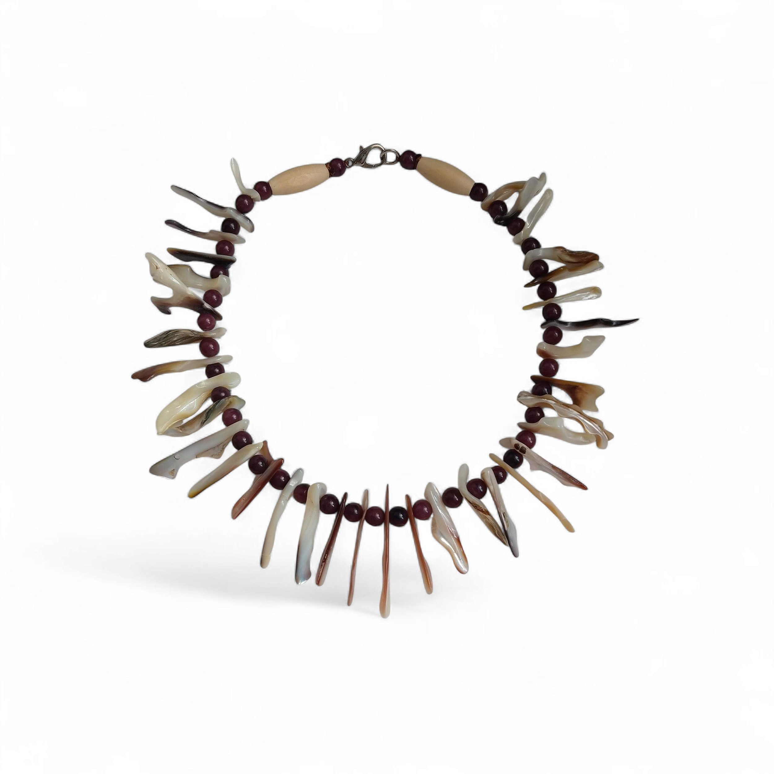 Colar com esferas Ágata cor bordô intercaladas com longas Madrepérolas com tonalidade rosê, finalizado com bujão madeira e fecho lagosta prata.. Comprimento 47 cm, largura 5 cm