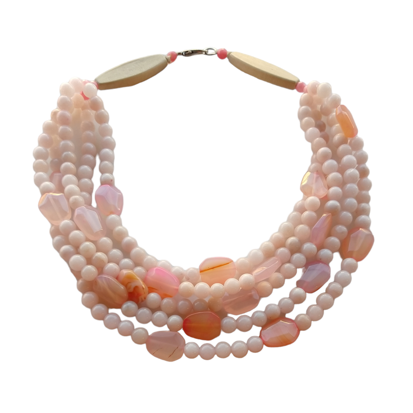 Colar 5 vias, pedra Quartzo rosa sapicada com Ágata sextavada irregular mesclada, finalizado com bujão madeira a Ágata. Comprimento 47 cm, altura 28 cm.