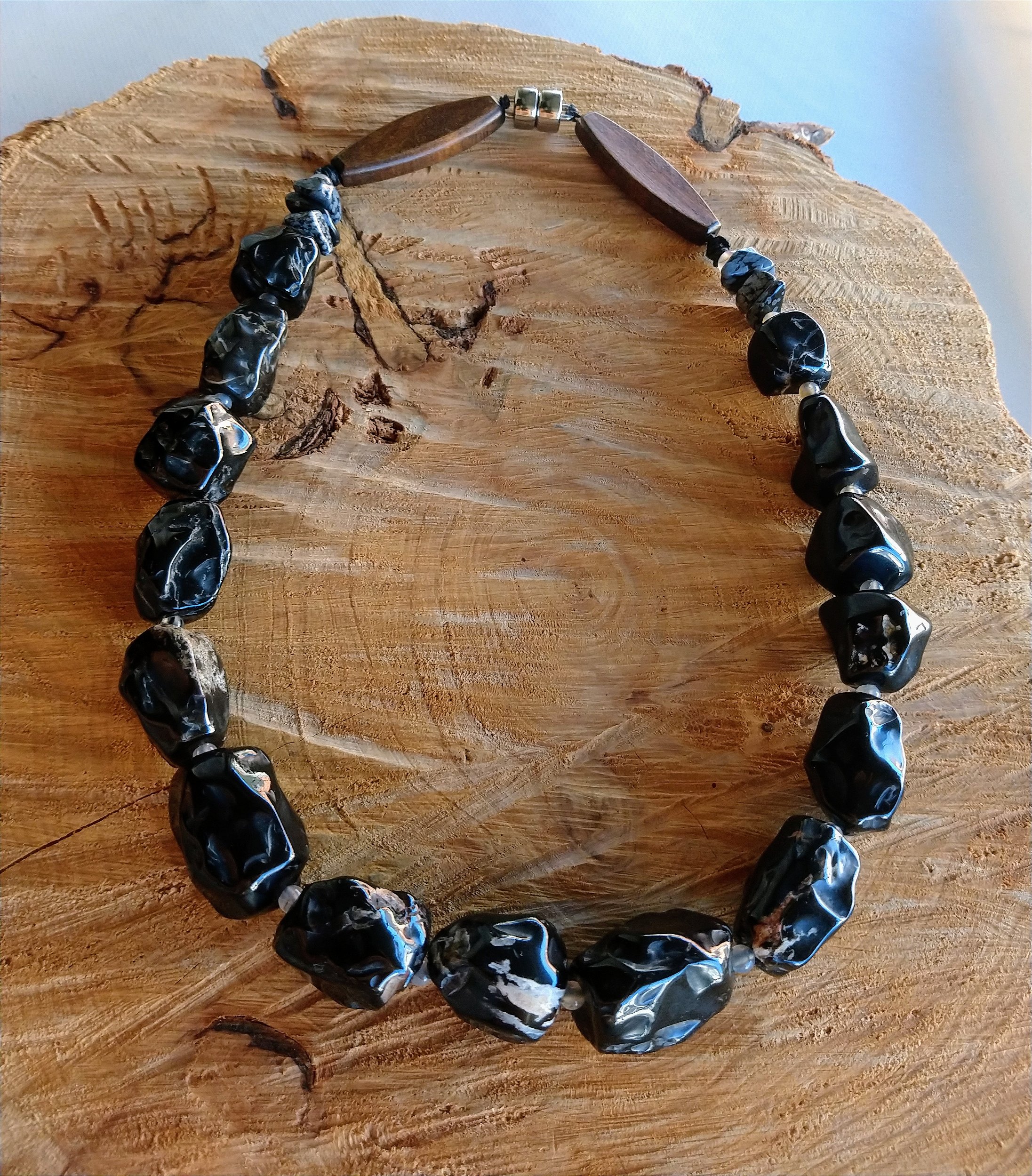 Colar pedra Ameixa, entremeio em Ágata translúcida, finalizado com bujão madeira e fecho imantado. Comprimento 62 cm