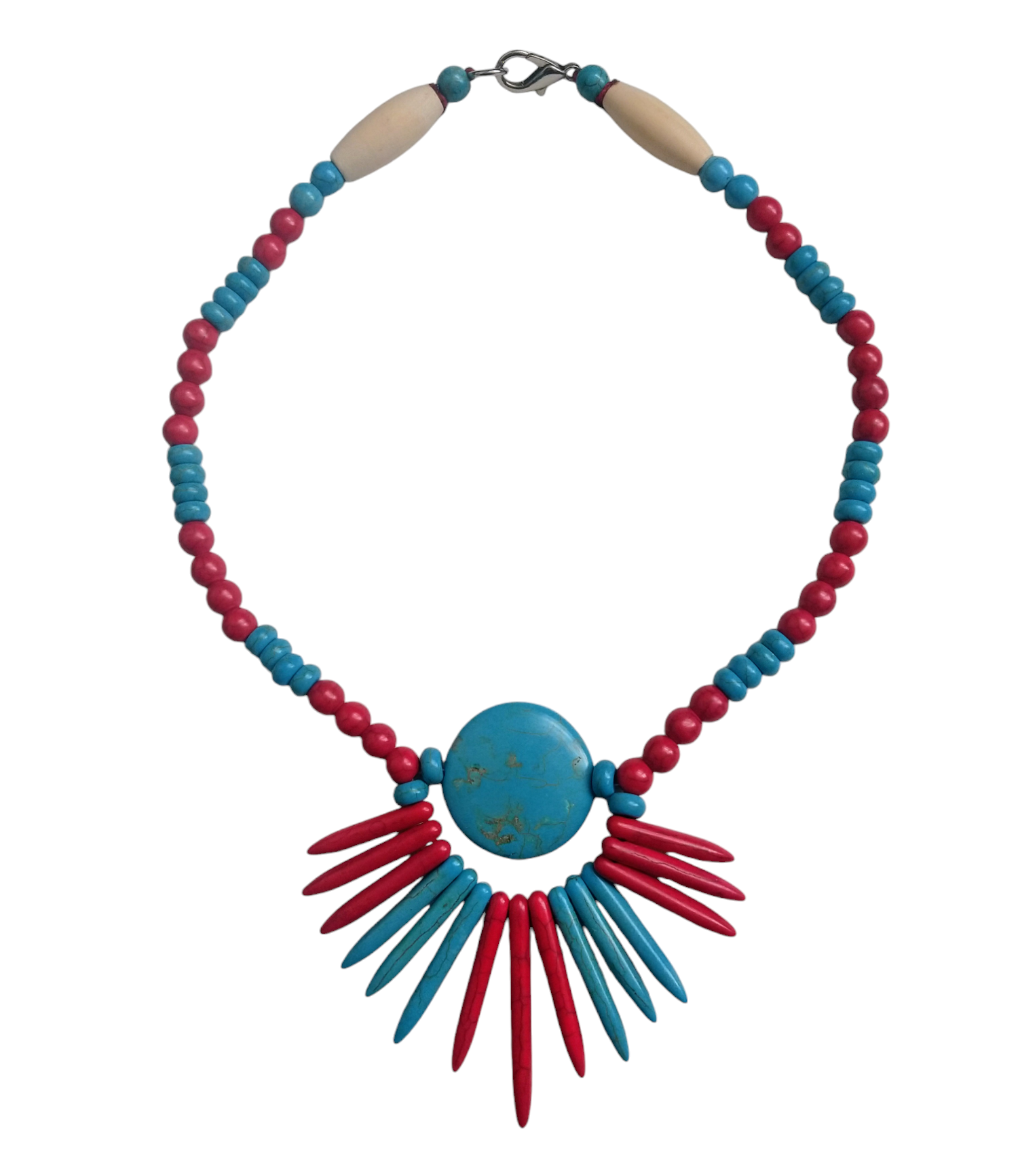 Colar com pedras howlitas de diversas formas e tamanhos, com cores turquesa e vermelho, o que representa força e equilíbrio. Designer único e ousado resulta num colar contemporâneo e cheio de personalidade, ideal para quem gosta de peças exclusivas que fazem uma declaração de estilo.