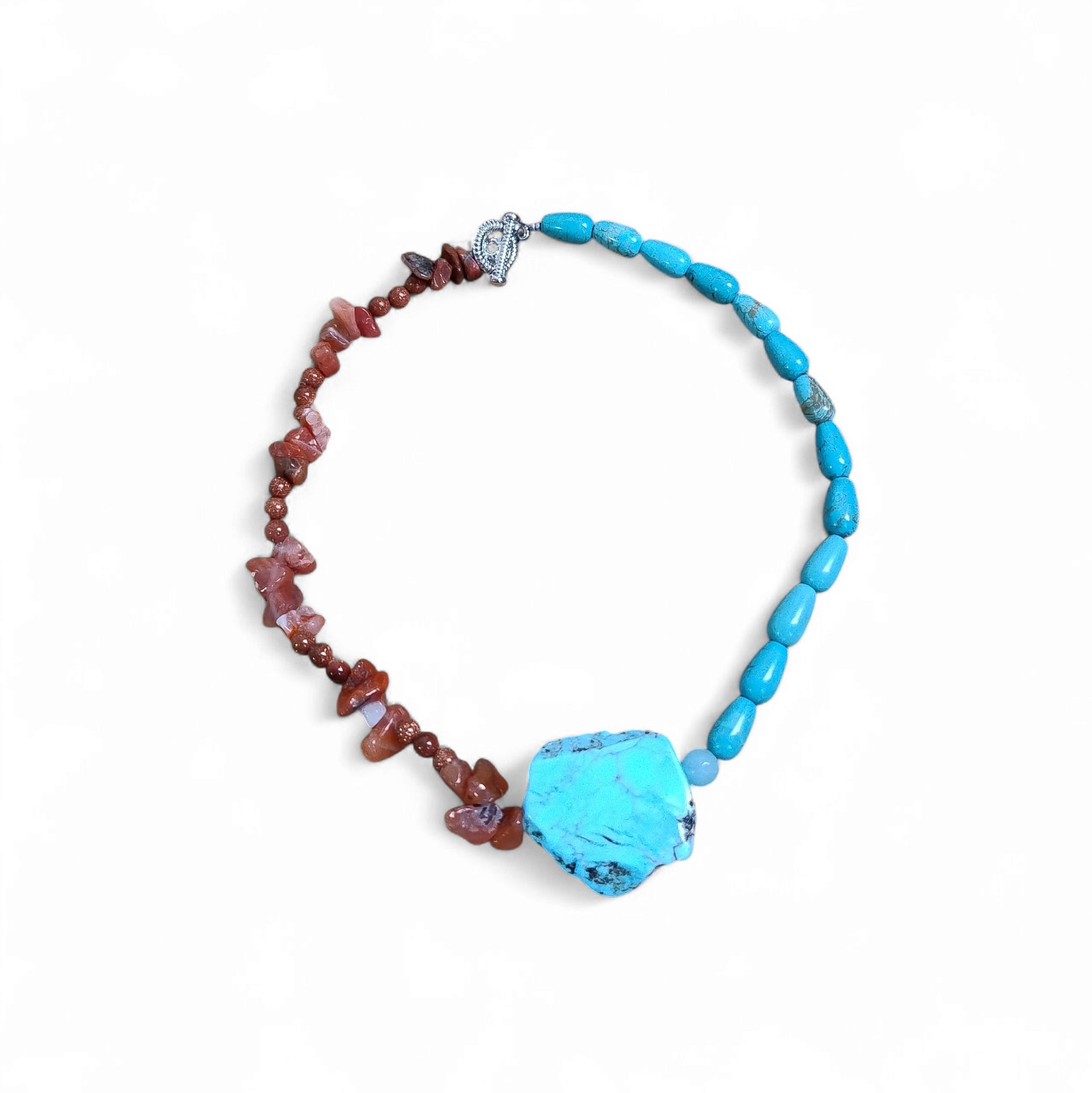 Colar com gota de howlita, cascalhos de ágata do fogo e chapa central de howlita — uma composição vibrante e cheia de personalidade.