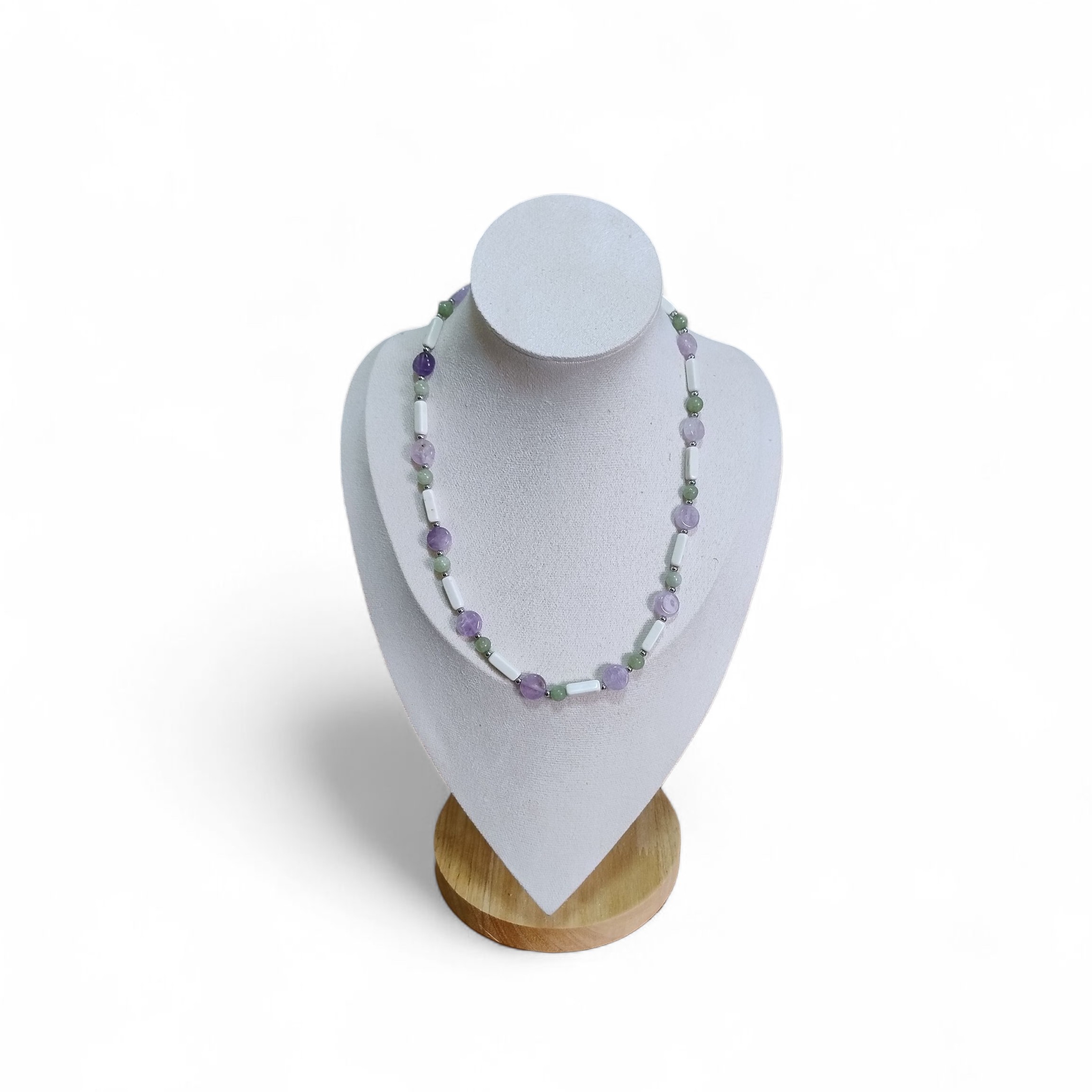 Choker cheia de charme, confeccionada com ametista, jade e howlita branca. Uma peça delicada que adiciona um toque sutil a looks descontraídos, sem abrir mão do estilo e da personalidade.