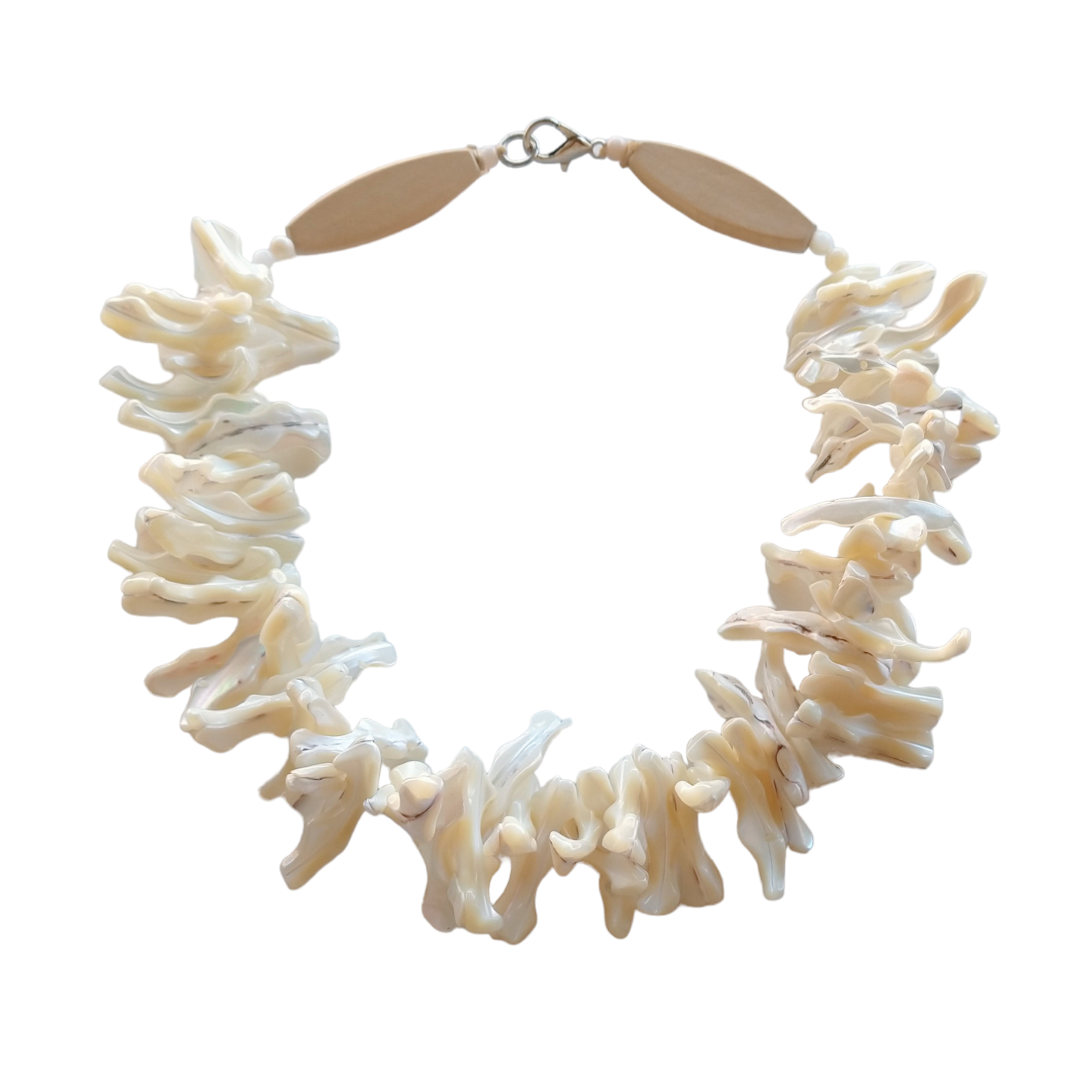 Colar todo em Madrepérola flutuante, finalizado bujão madeira e esfera Madrepérola. Comprimto 51 cm