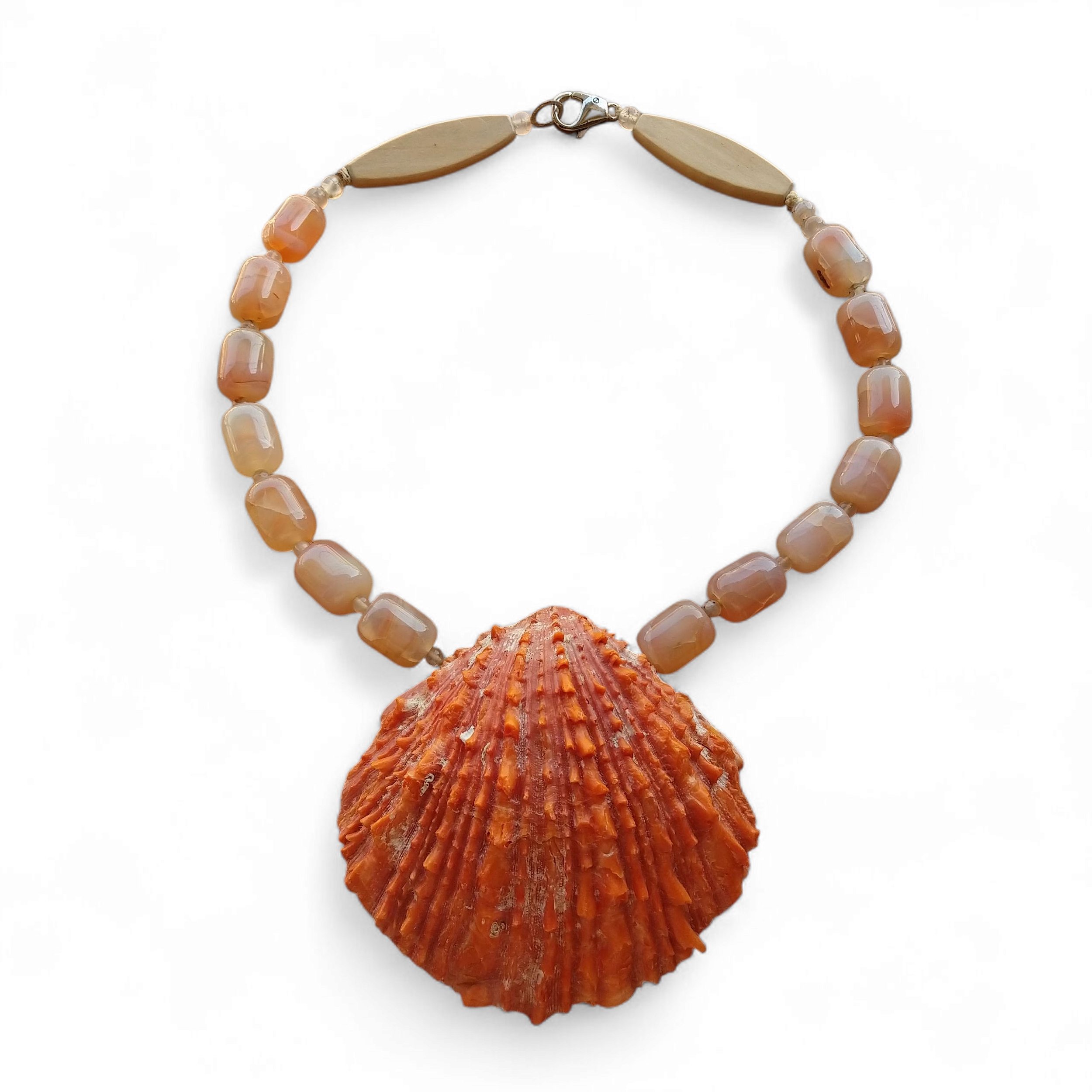 Colar confeccionado com ágata e verdadeira concha Spondylus — uma peça atemporal que une o requinte da natureza à leveza do tom salmão. Sofisticado e orgânico, é o acessório perfeito para quem aprecia design natural e elegância com personalidade.