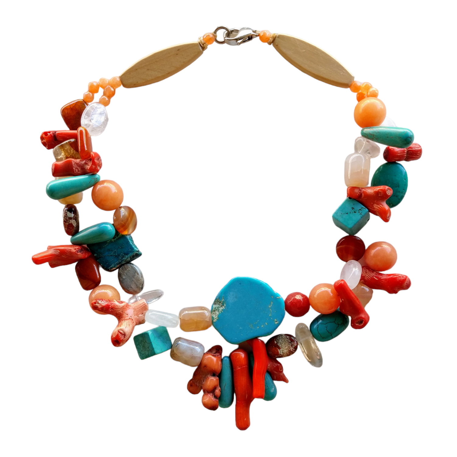 Colar pedras Quartzo, Ágata, Howlita, Jasper e Coral, finalizado com bujão madeira e fecho imantado, comprimento 52 cm, altura 28 cm