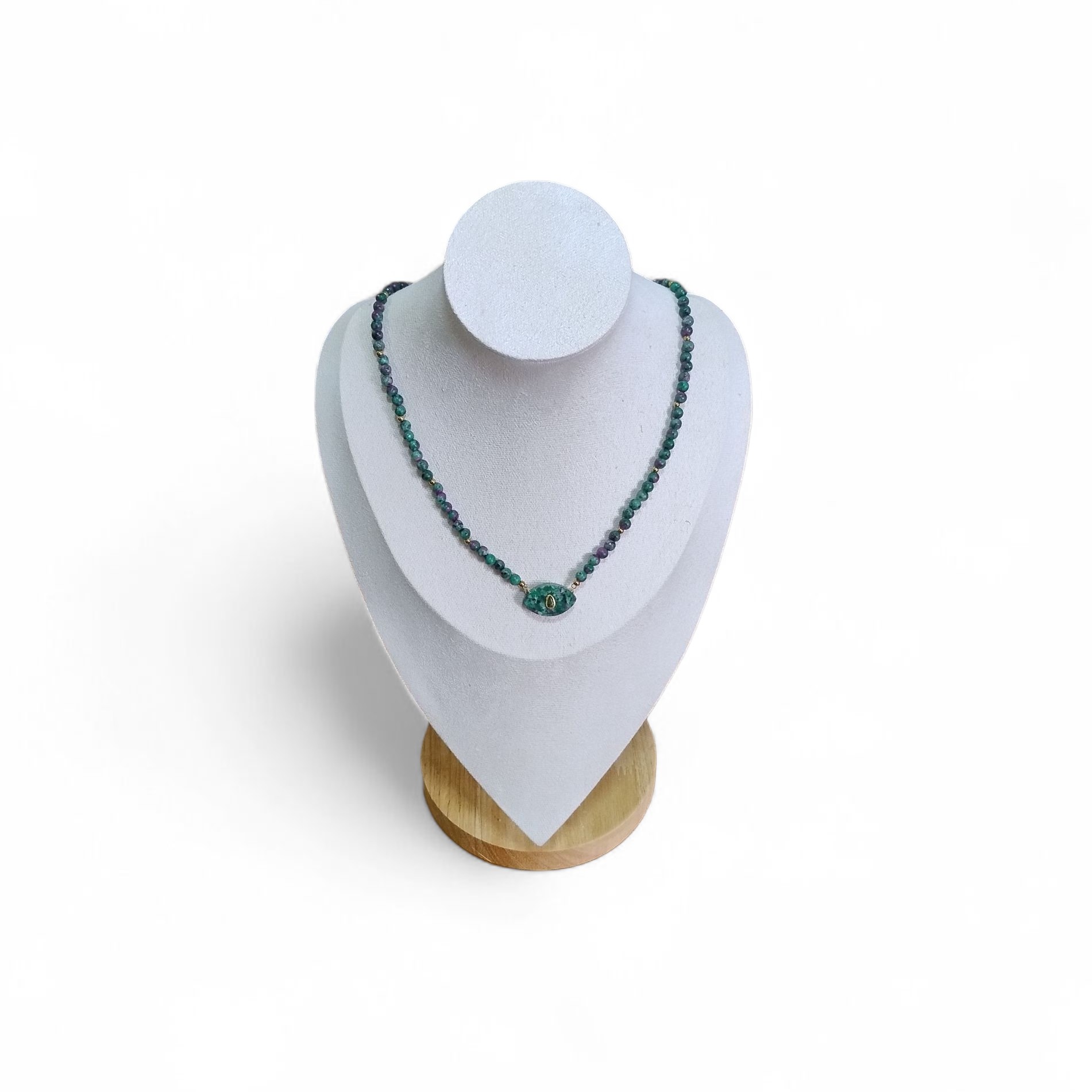 Um colar delicado e sofisticado, criado com pequenas esferas de rubi zoisita em tons de verde com nuances roxas que se misturam de forma natural, criando um efeito visual profundo e hipnotizante. No centro, um pingente da mesma pedra se destaca com um aplique de zircônia verde e detalhes dourados que acrescentam brilho, elegância e um toque de luz suave. Uma peça que une beleza orgânica, energia acolhedora e charme artesanal, perfeita para mulheres que apreciam acessórios únicos, cheios de personalidade e delicadeza.