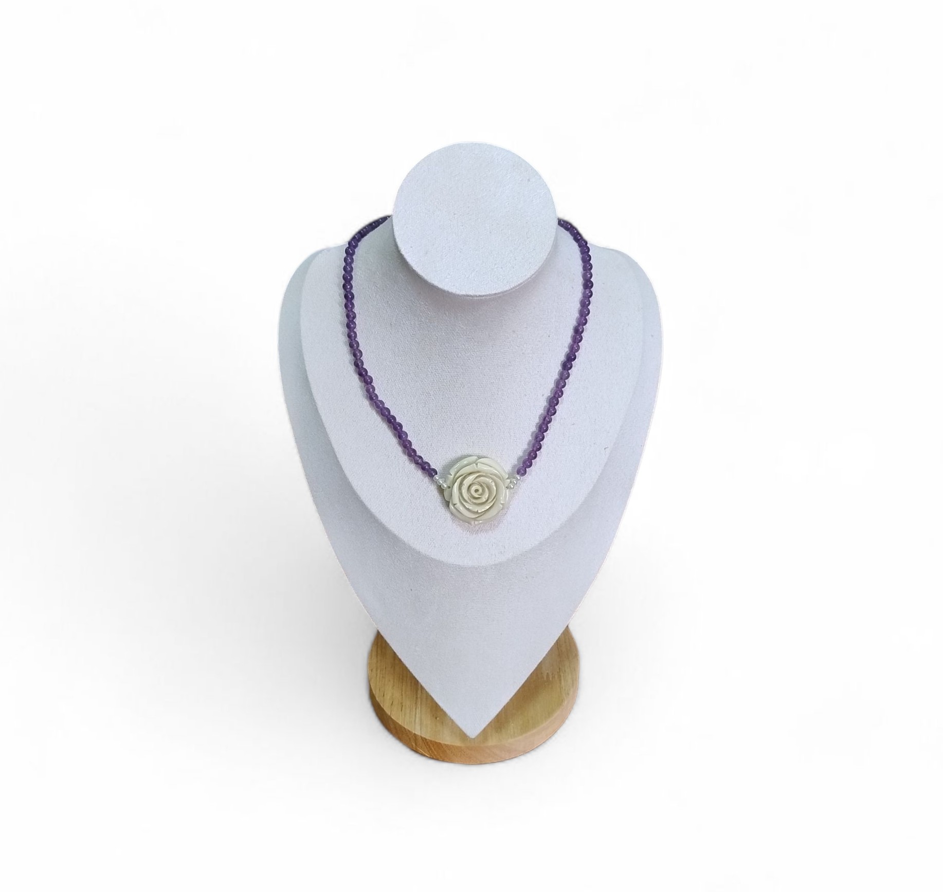 Colar delicadamente elaborado com mini pérolas, pedra ametista e uma flor em acetato que é puro charme. Um design minimalista, porém marcante, que combina com tudo e valoriza qualquer look — do casual ao sofisticado. Um acessório versátil para todas as ocasiões, que traz leveza e elegância na medida certa.