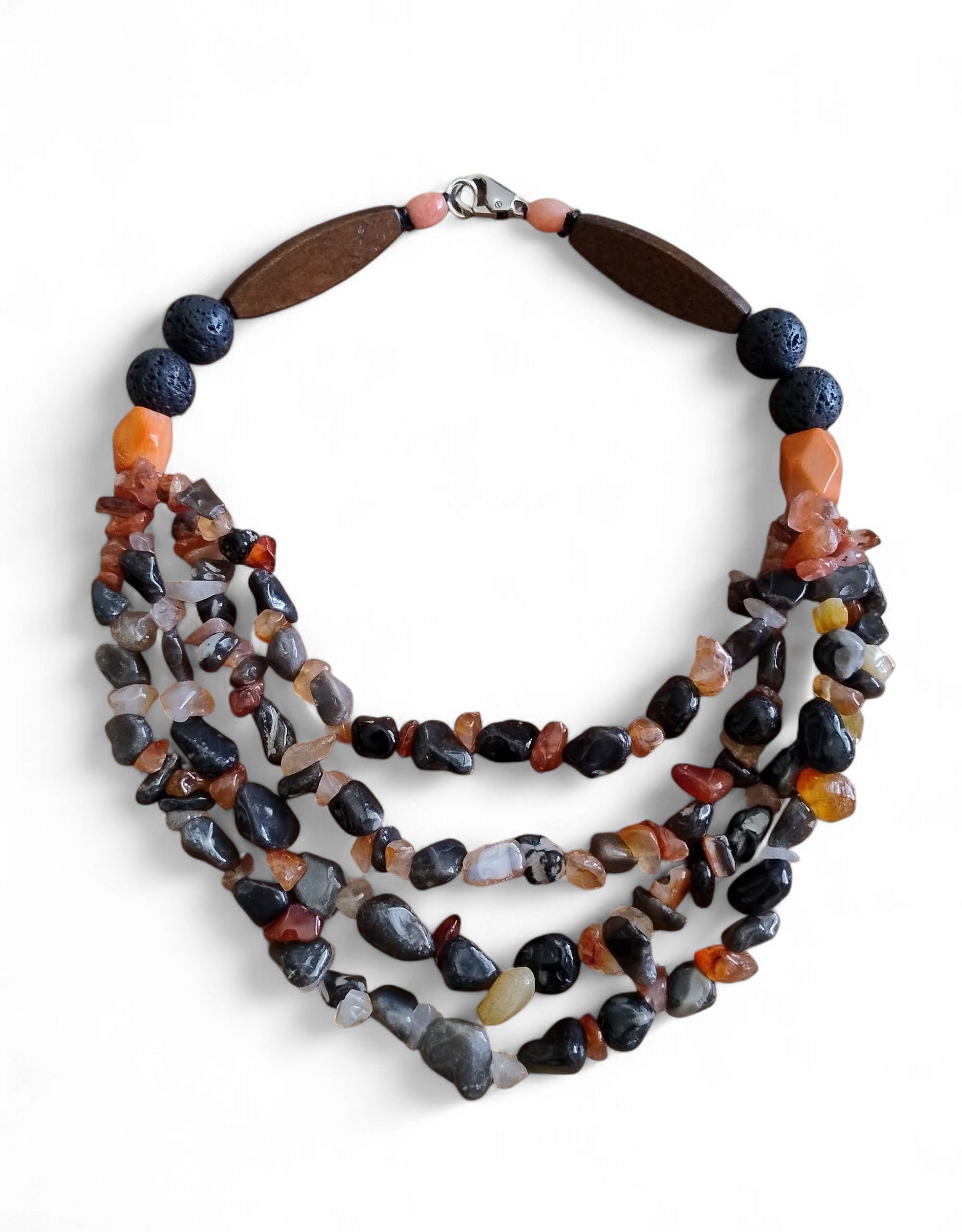 Um maxi colar de quatro camadas, criado a partir de um mix harmônico de citrino, obsidiana e ágata, finalizado com pedra vulcânica e coral lapidado.