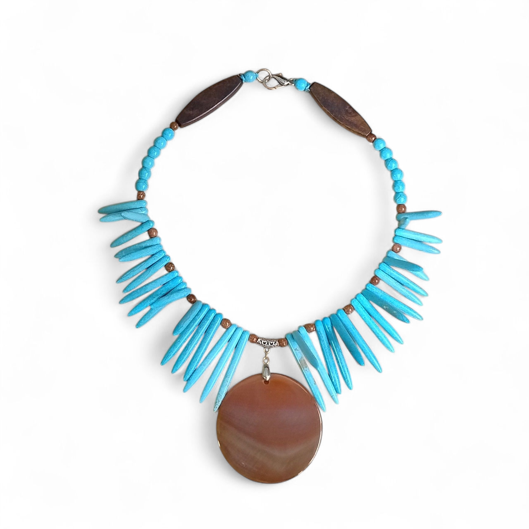 Maxi colar em tons icônicos de turquesa e marrom, uma combinação irresistível que transmite leveza e estilo. Confeccionado com longuetes de howlita e pingente redondo lapidado, é uma peça charmosa, despretensiosa e cheia de atitude — perfeita para quem gosta de elegância com liberdade. Finalizado com madeira e fecho em aço.