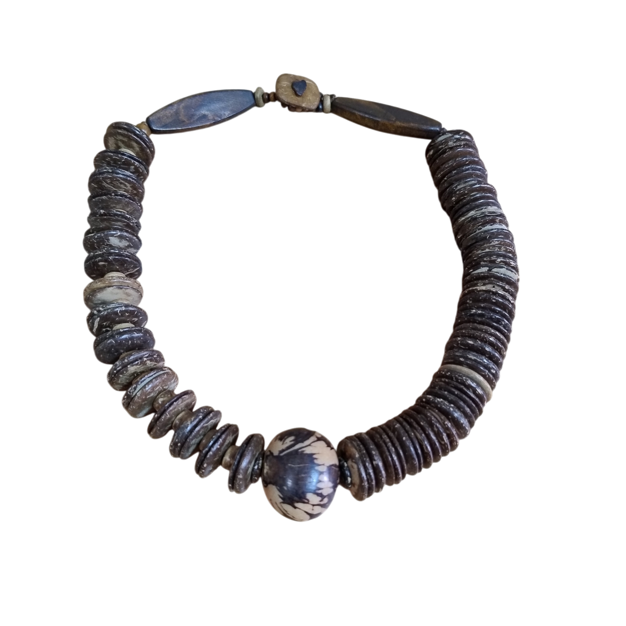Colar todo em fibra de côco, com semente de jarima na mesma tonalidade, comprimento 51 cm