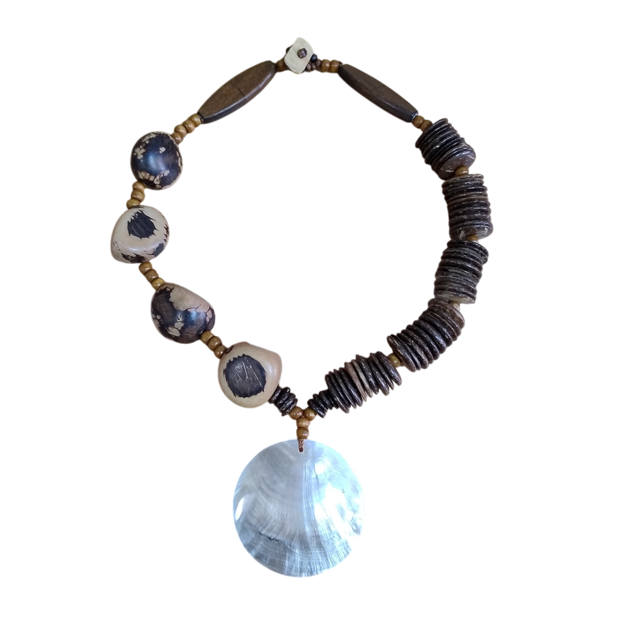 Colar confeccionado com disco de côco, madeira, semente de jarima e pingente madrepérola diâmetro 8 cm, altura fechado 32 cm e comprimento -aberto 54 cm