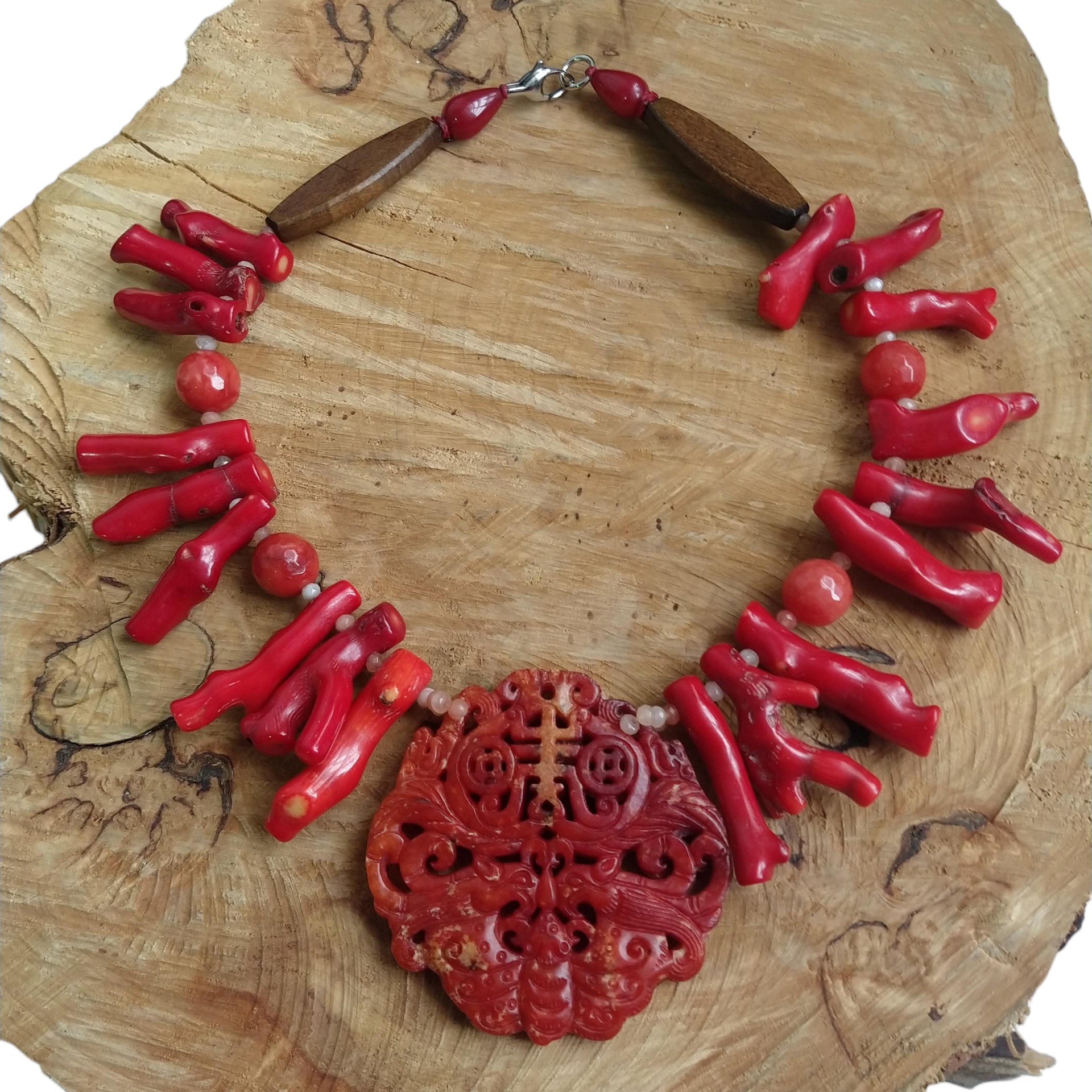 Um colar que é puro magnetismo. Confeccionado com corais vermelhos, mini jades no tom melancia e uma mandala esculpida em jade, esta peça exala vitalidade e sofisticação. Cada detalhe carrega a força das pedras naturais e a energia vibrante das cores, criando uma joia única, marcante e cheia de boas vibrações.
