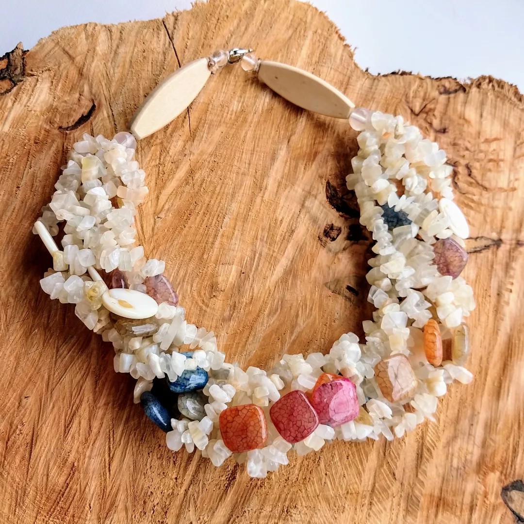 Colar 6 vias, cascalho de pedras Opala salpicado com Ágata cores e Madrepérola, finalizado com bujão madeira e fecho lagosta. Comprimento 46 cm, altura 28 cm