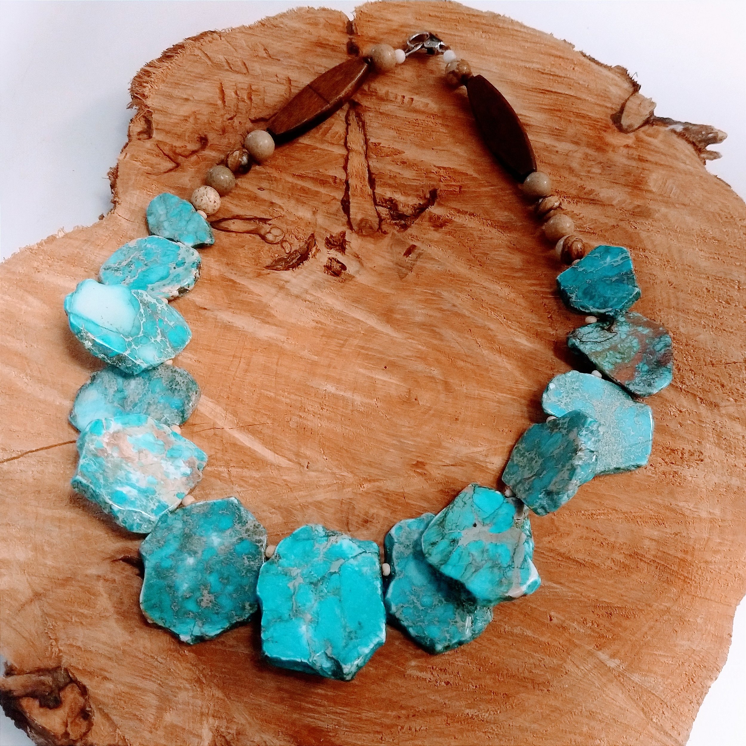 Colar pedra laje de Jasper imperial entre 4 a 5 cm e detalhes em pedra Jasper madeira, finalizado com bujão madeira e fecho lagosta prata e pedra Olho de Tigre facetadas. Comprimento 52 cm