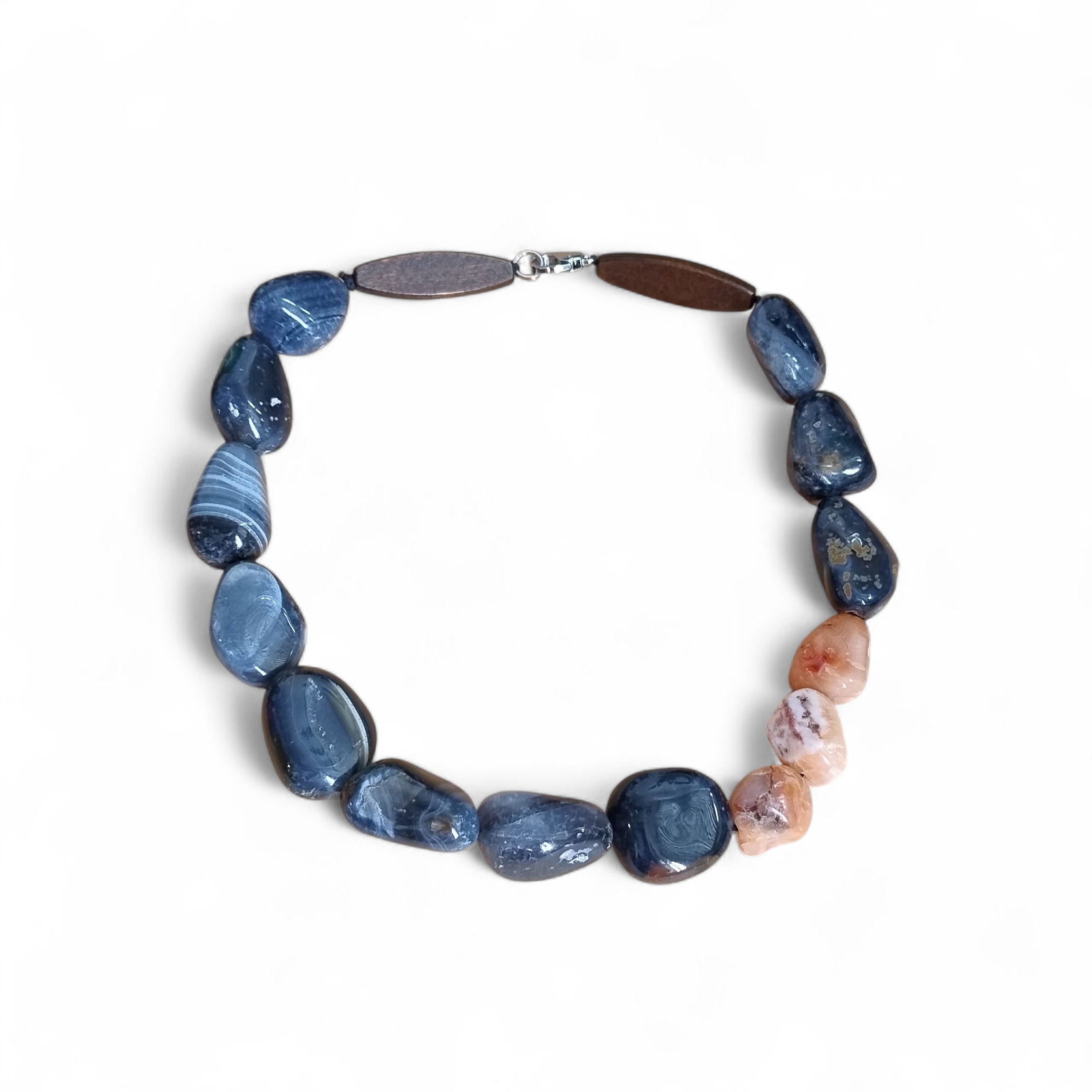 Colar de presença marcante, confeccionado com robustas ágatas mescladas em tom azul-petróleo e jasper's salmão. Um mix harmônico de cores e texturas, pensado para quem aprecia grandes pedras e peças de personalidade. O acabamento em madeira e o fecho lagosta em ródio completam o design com elegância e sofisticação.