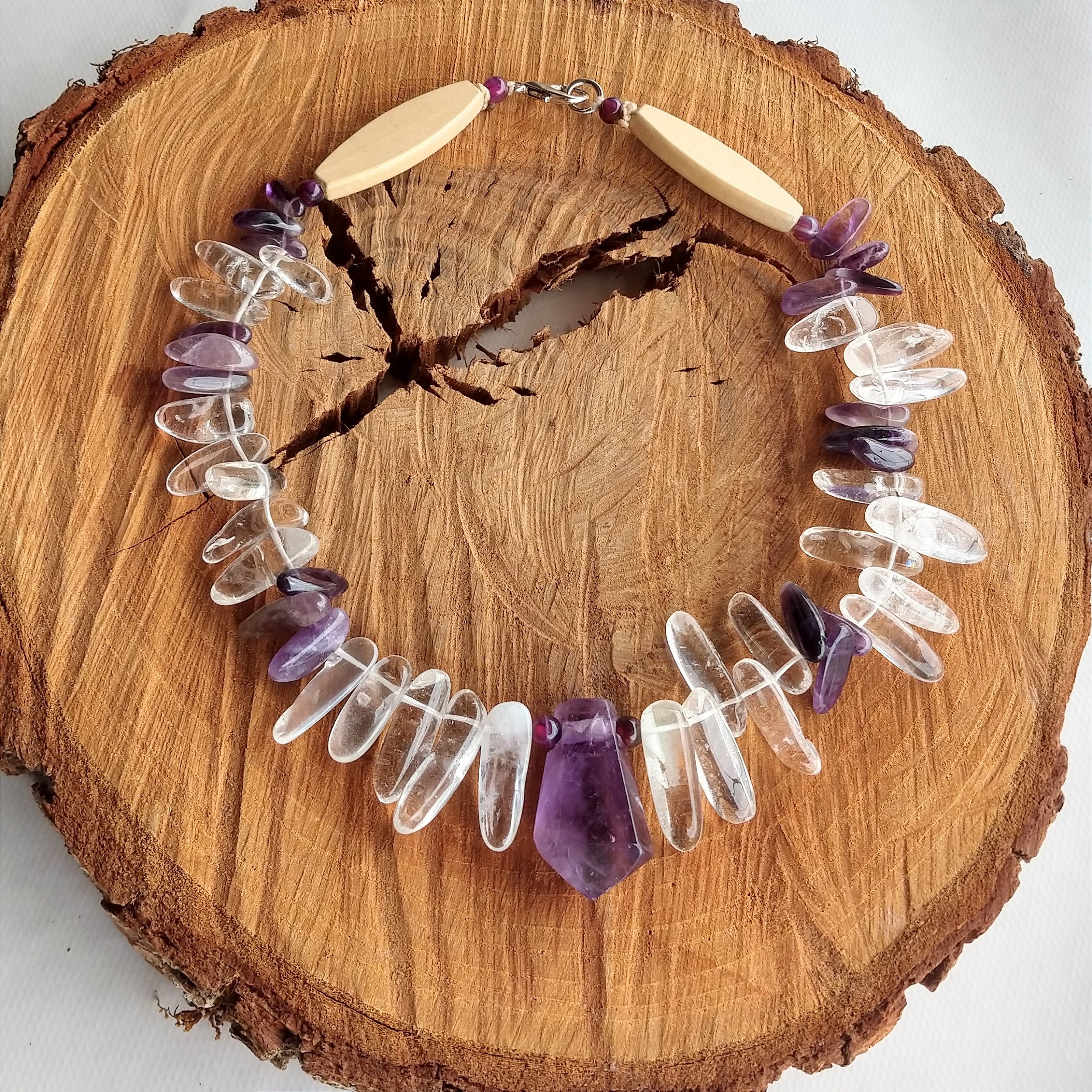 Colar pedras Quartzo Cristal e Ametista com pingente Ametista lapidação diamante, finalizado com bujão madeira e fecho lagosta prata. Comprimento 48 cm, pingente 3,5 x 2 cm