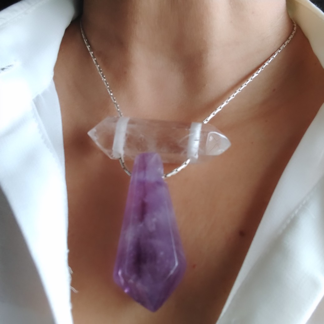 Corrente prata 925com enorme pedras naturais lapidadas Ametista e Quartzo. Comprimento corrente 5 cm, Quartzo 6,5 x 2 cm, Ametista 6,0 x 2,8 cm.