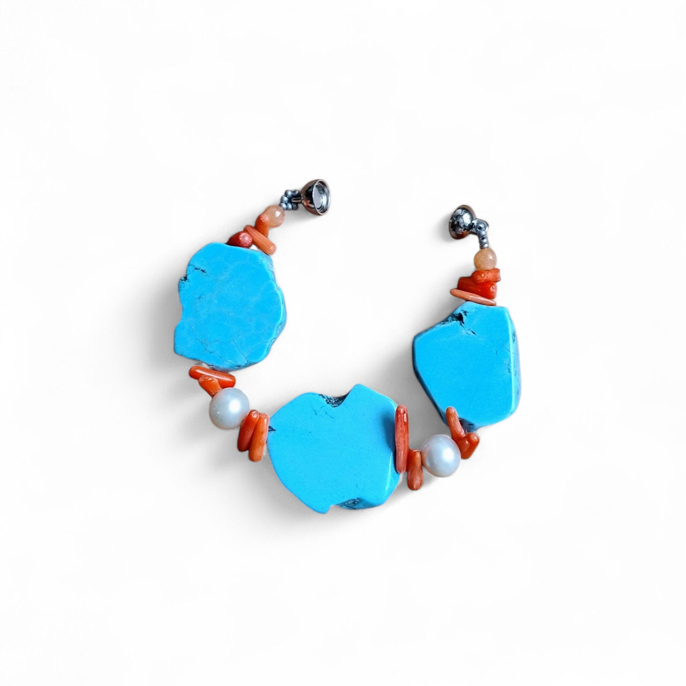 Pulseira de sucesso, com chapas de howlita, mini corais e pérola de água doce, combinando elegância e charme em um design que se destaca. Fechamento imantado para praticidade e estilo.